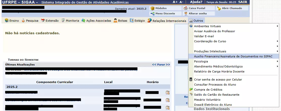 O primeiro caminho é encontrado por meio do SIGAA, seguindo: Outros > Auxílio Financeiro/Assinatura de Documentos no SIPAC. Ao clicar nessa opção, será aberta uma visualização do SIPAC.