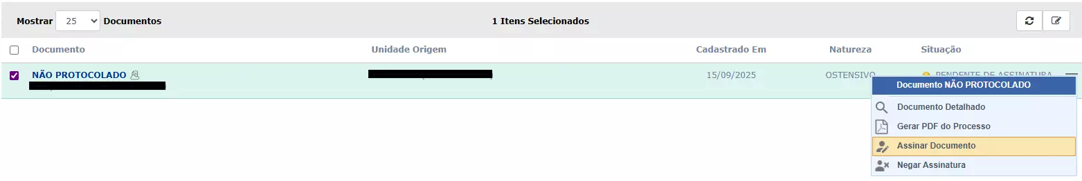 Ao colocar o mouse sobre Processos, será possível visualizar a opção "Assinar Documentos".